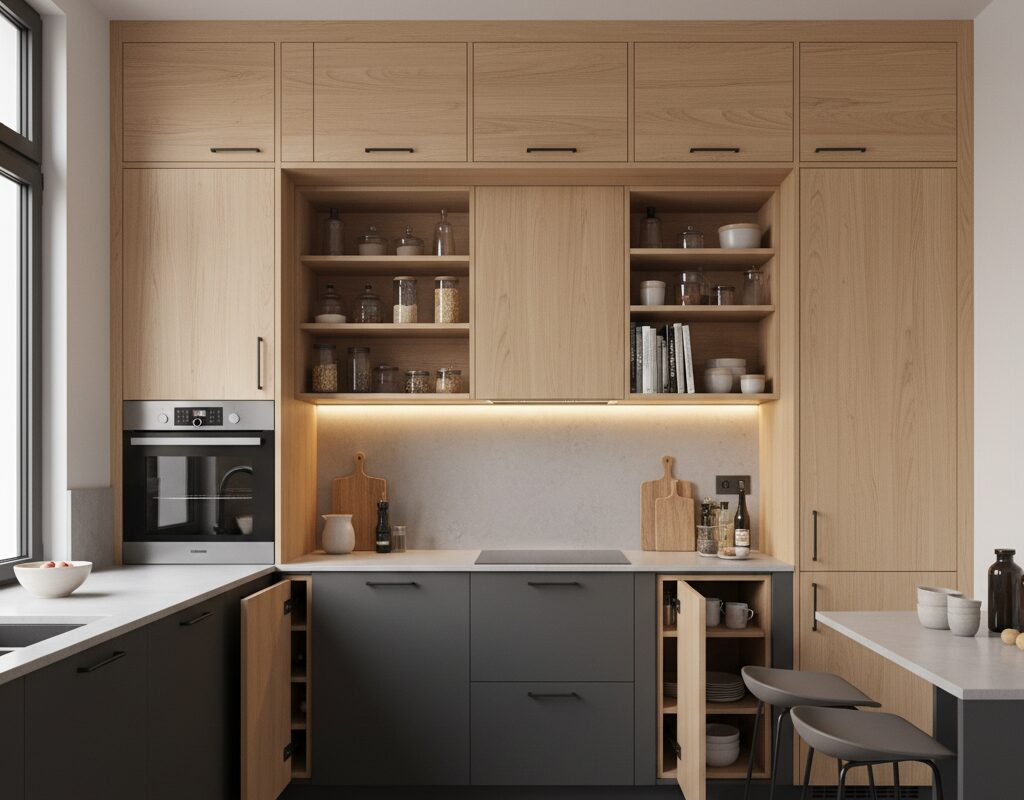 扉付き棚とオープン棚を組み合わせ、使い勝手と見せる収納を両立。色や素材の統一感が空間に落ち着きを与えます。