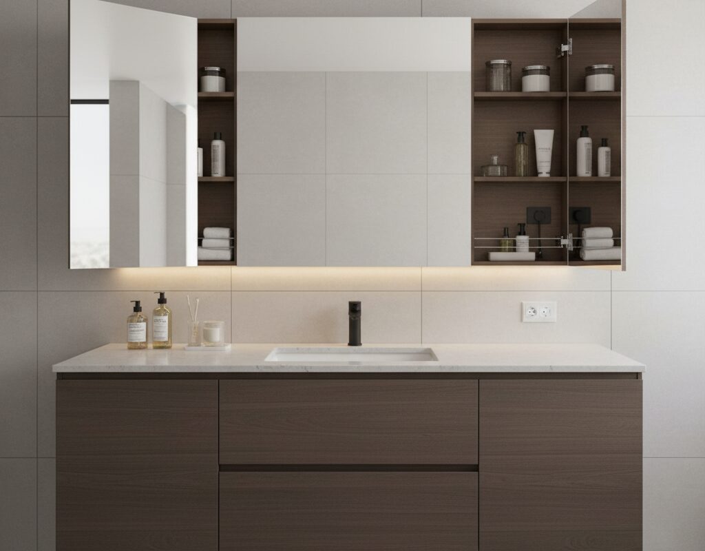 鏡の裏に収納スペースを設け、歯ブラシや化粧品などをすっきり収納。シンプルでスタイリッシュなデザインが特徴。