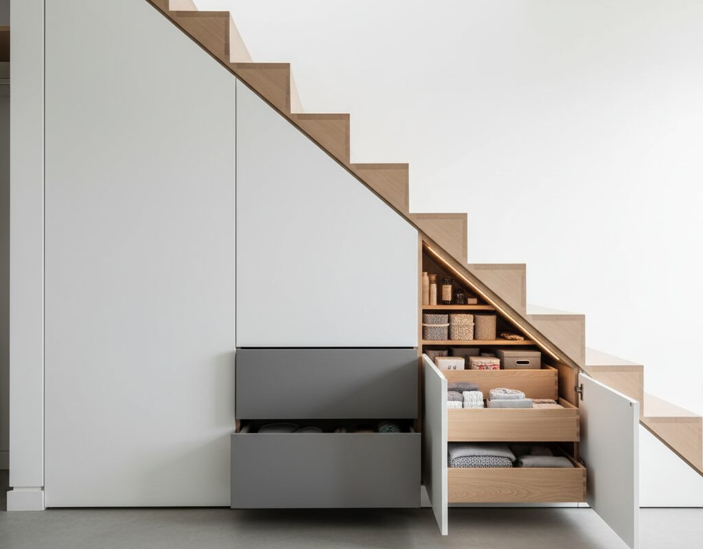 デッドスペースを有効活用した階段下収納。引き戸やスライド棚で取り出しやすさを確保しつつ、デザイン性も損なわない工夫を実施。
