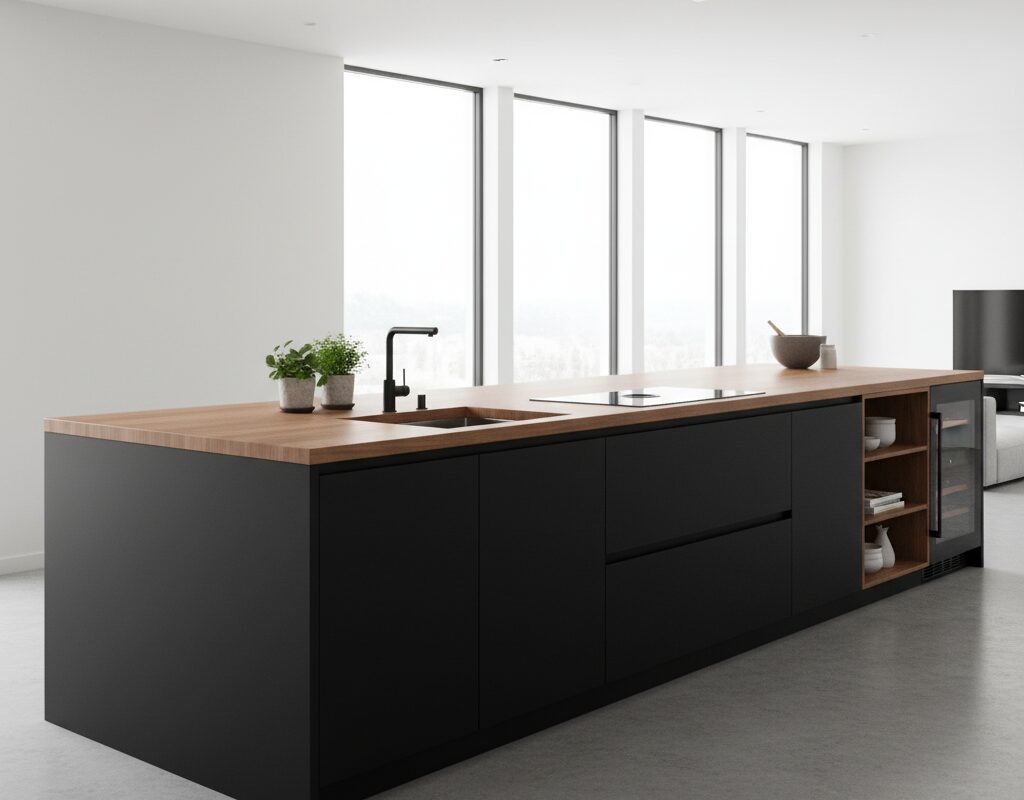 黒のマット仕上げと木目を組み合わせた造作アイランドキッチン。調理スペースと収納スペースを一体化させ、作業効率を高めつつデザイン性も追求。