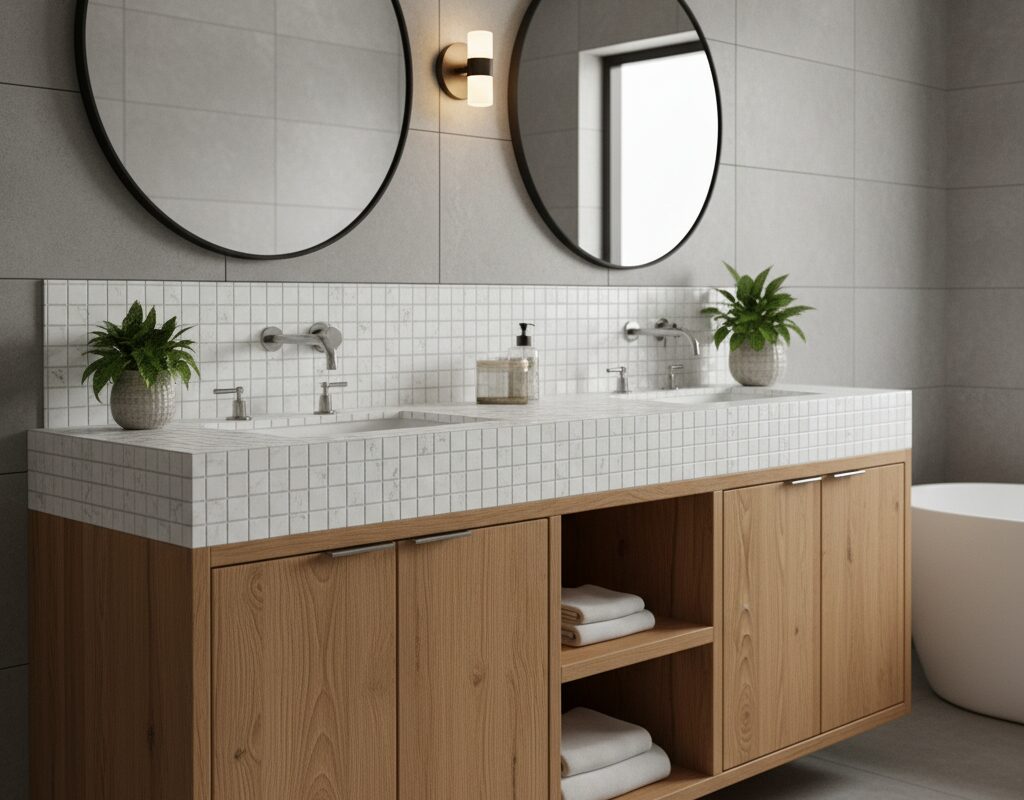タイル仕上げの天板に無垢材の収納キャビネットを組み合わせた洗面台。清潔感と温かみを両立し、ホテルライクな雰囲気を演出。