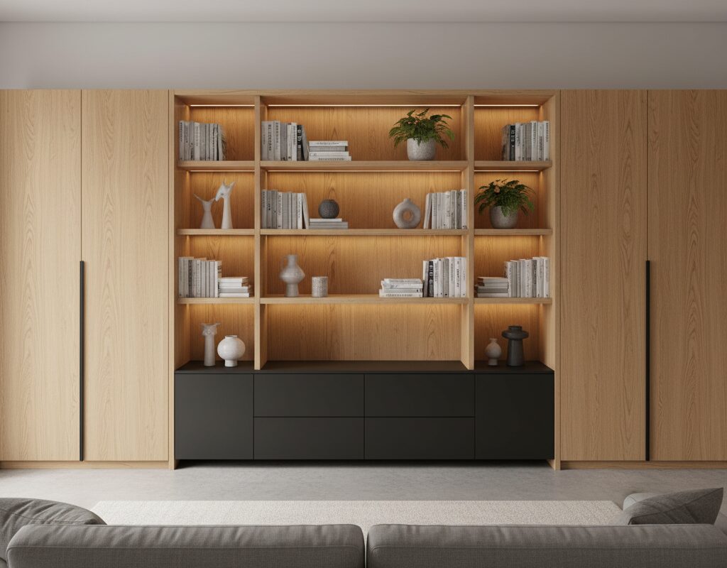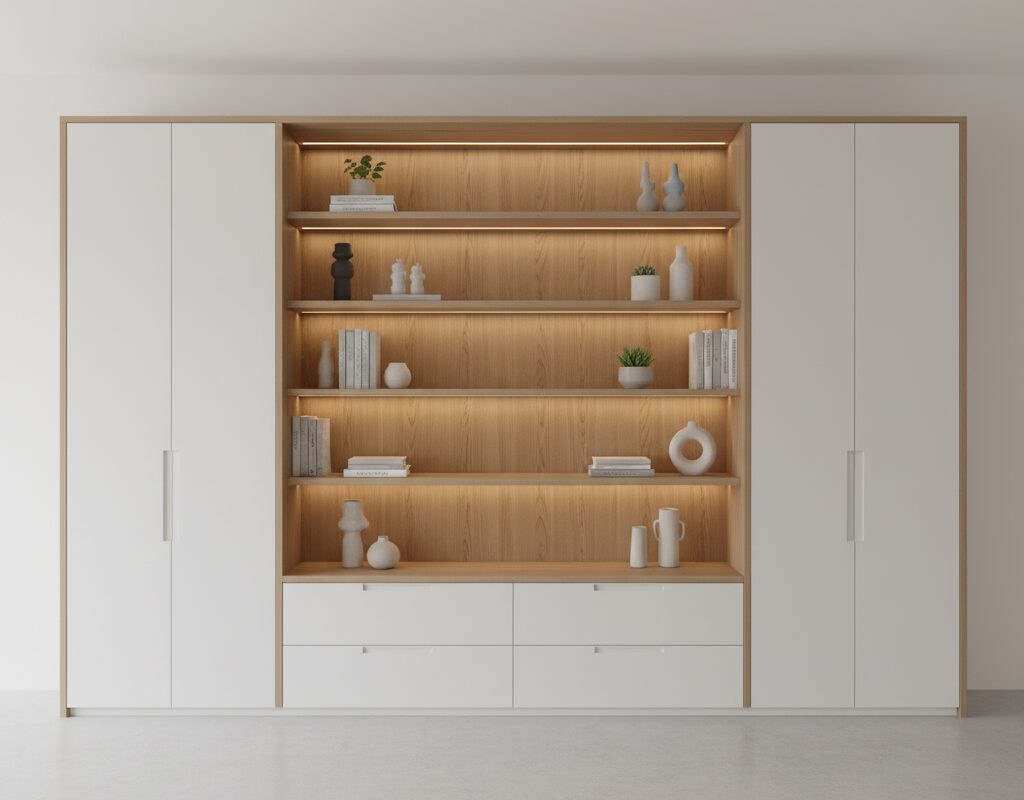 扉付き棚とオープン棚を組み合わせ、使い勝手と見せる収納を両立。色や素材の統一感が空間に落ち着きを与えます。