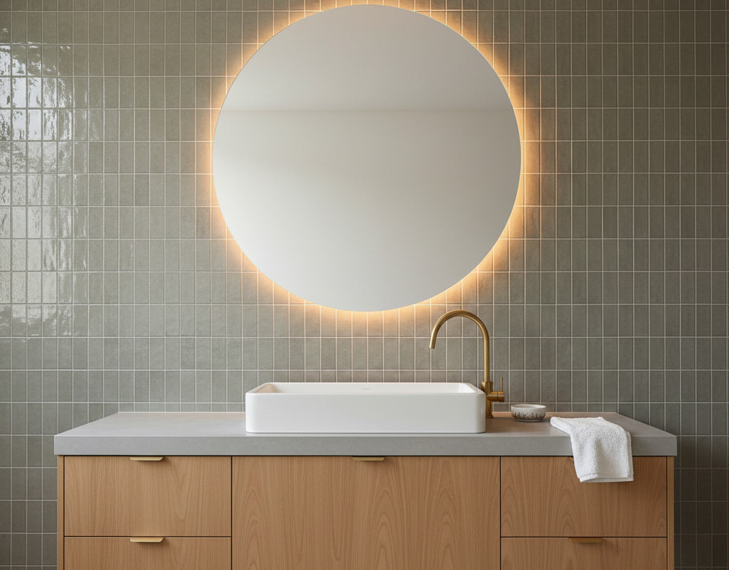 - 洗面台: 顔を綺麗に照らす演色性の高い照明を。鏡越しに輸入クロスの柄が映える位置へ。