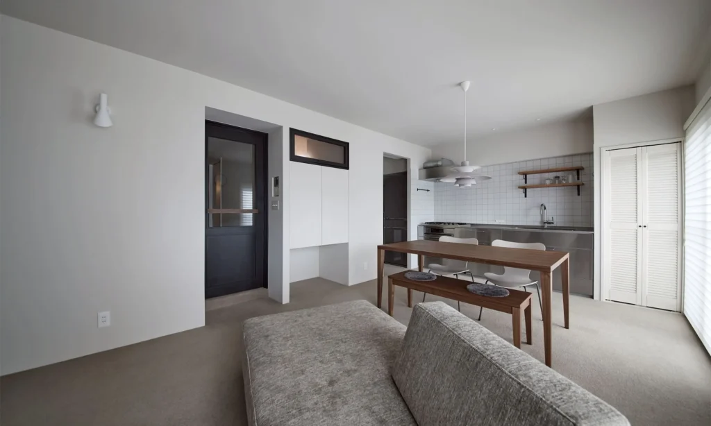 光が奥まで届く開放的なリビングを実現する為、間取り変更を行い南側向きにLDKを配置。上質なウール100%カーペットや職人仕上げの美しい造作建具、さらに、名作照明である「Louis Poulsen(ルイスポールセン)」の柔らかな光や、「ACTUS(アクタス)」の洗練されたインテリアを空間設計の段階からトータルでコーディネートしています。LDKにわんちゃんスペースも確保し家族でくつろげる空間をご提案致しました。厳選された素材と美しい照明と家具が静かに引き立て合う、極上の都市型リノベーションです。